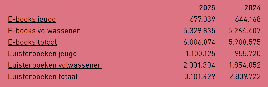 De KB leende vorig jaar 6,0 miljoen e-boeken en 3,1 miljoen luisterboeken uit via de online bibliotheek. Dat is +0,2 miljoen respectievelijk +0,4 miljoen meer dan in 2024. In procenten is dat bij elkaar opgeteld circa 5% groei. Ook zijn er meer leden voor de online bibliotheek, blijkt uit het jaarverslag: +15% (specifiek voor jeugdleden is het +16%). Het aantal actieve gebruikers steeg met 4% (specifiek voor jeugdleden met 6%). De concurrent van commerciële streamingdiensten heeft inmiddels ruim 49.000 e-boeken, bijna 17.000 luisterboeken en 79 tijdschrifttitels in de collectie.